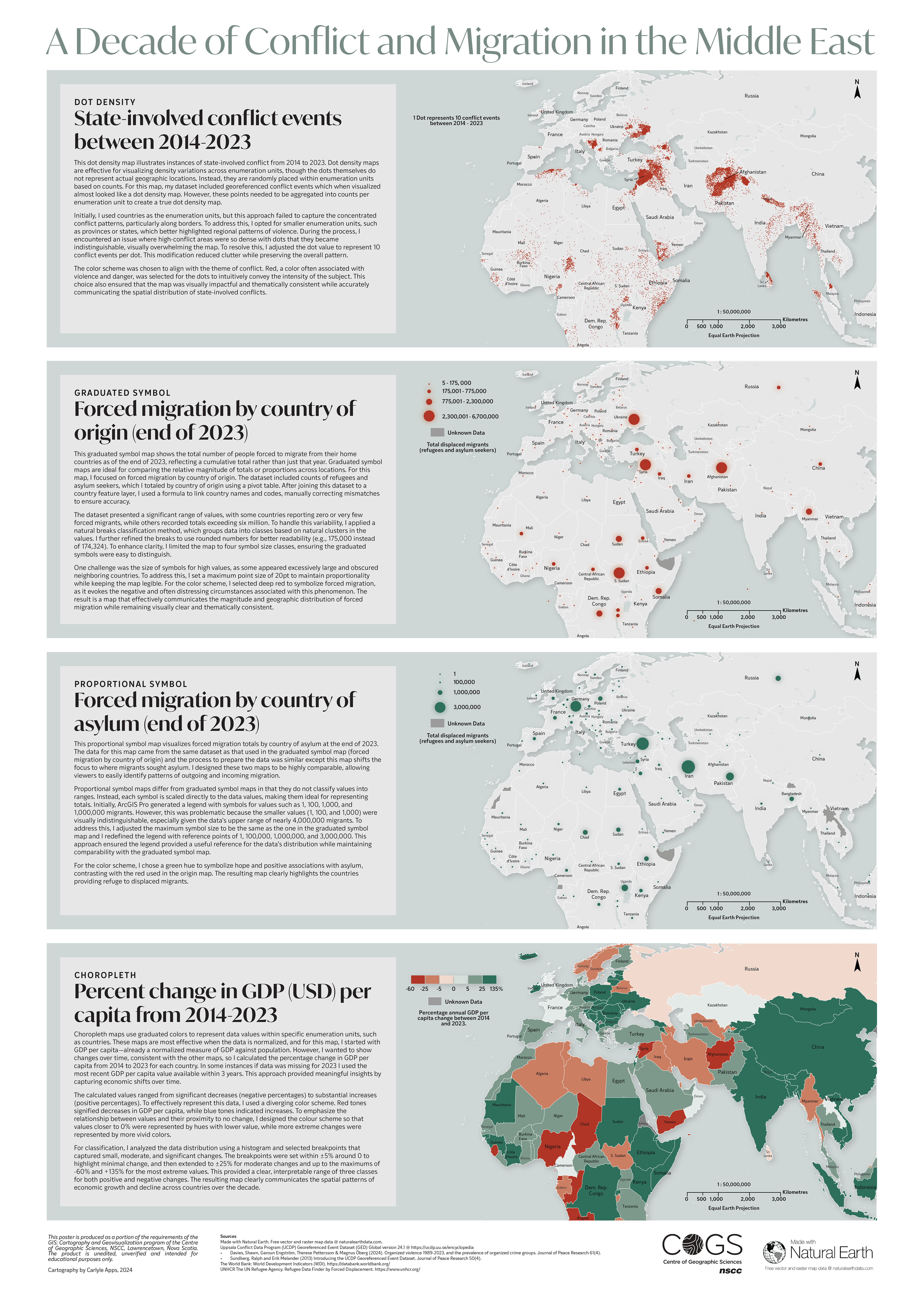 Thematic statistical mapping poster showcasing four statistical maps - dot density, graduated symbol, proportional symbol and choropleth. Conducted data acquisition, processing and visualization, applying correct symbology for each map type. Further customized the design in Adobe Illustrator including use of custom legends and a descriptive paragraph for each map.