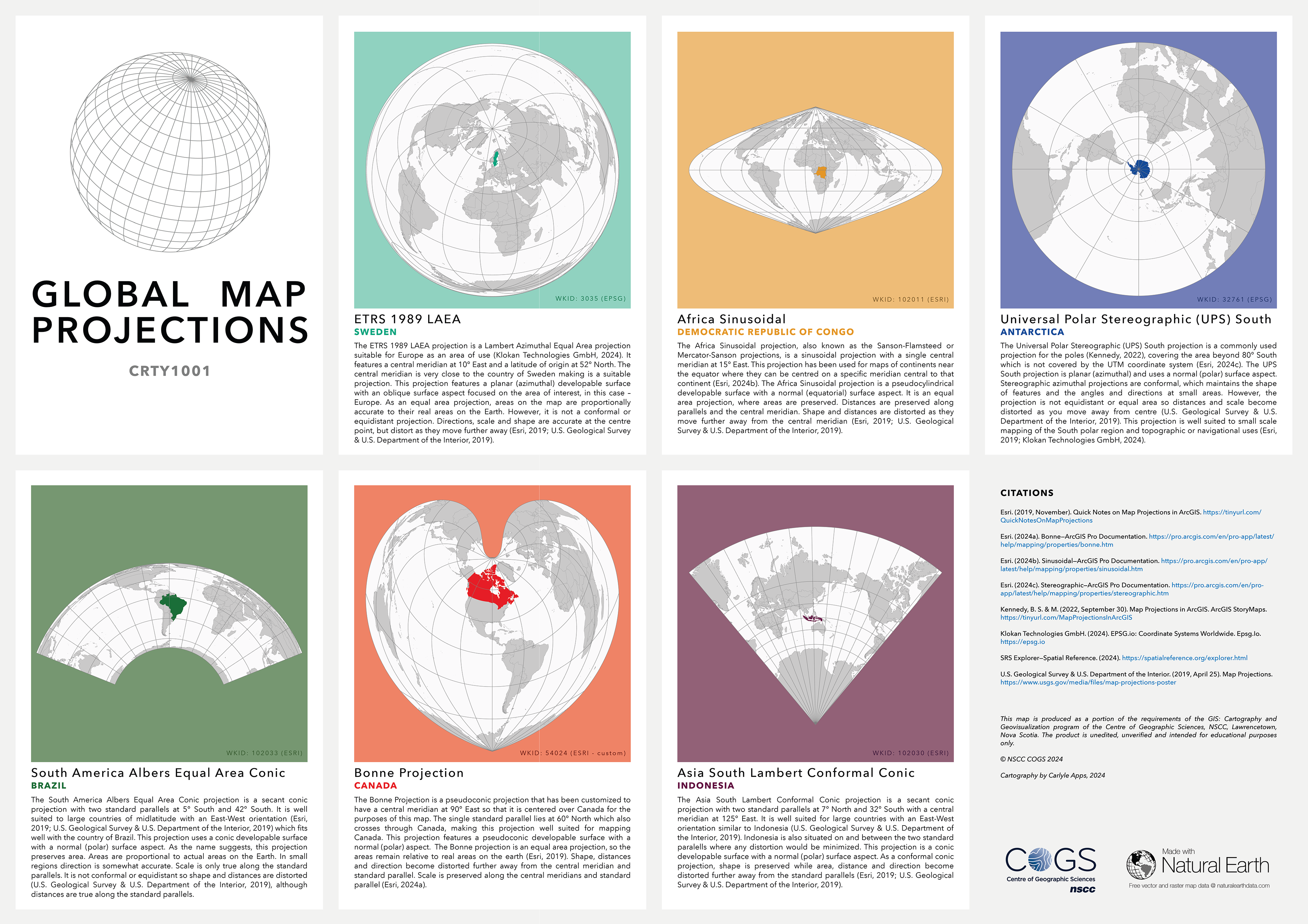 This poster project involved selecting and justifying appropriate projected coordinate systems for six countries across different hemispheres and latitudes. After researching common projections and testing options for each, I identified the most suitable system based on factors like developable surface, aspect, and distortion. The final design features a visually cohesive card-style layout, with color themes for each country and subtle backgrounds to highlight the projections. I included WKIDs for quick reference and aimed for a balance between clarity, accuracy, and visual appeal.