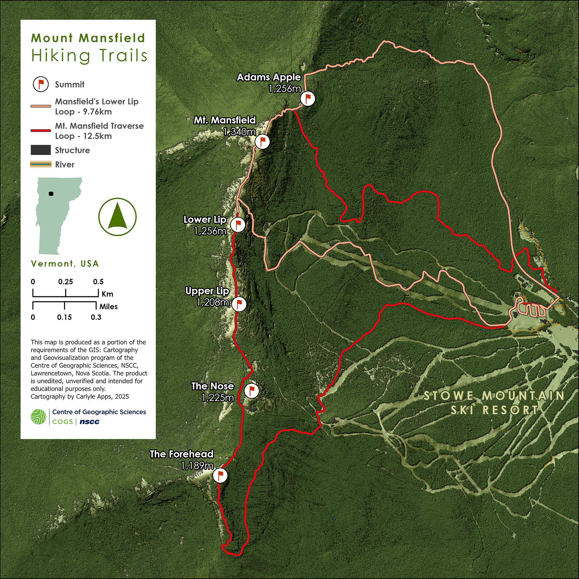 This map of Mount Mansfield in Vermont uses high-resolution LiDAR data to create a detailed large-scale realistic 3D map while incorporating vector data and map components to create a final map with a clear purpose and use.