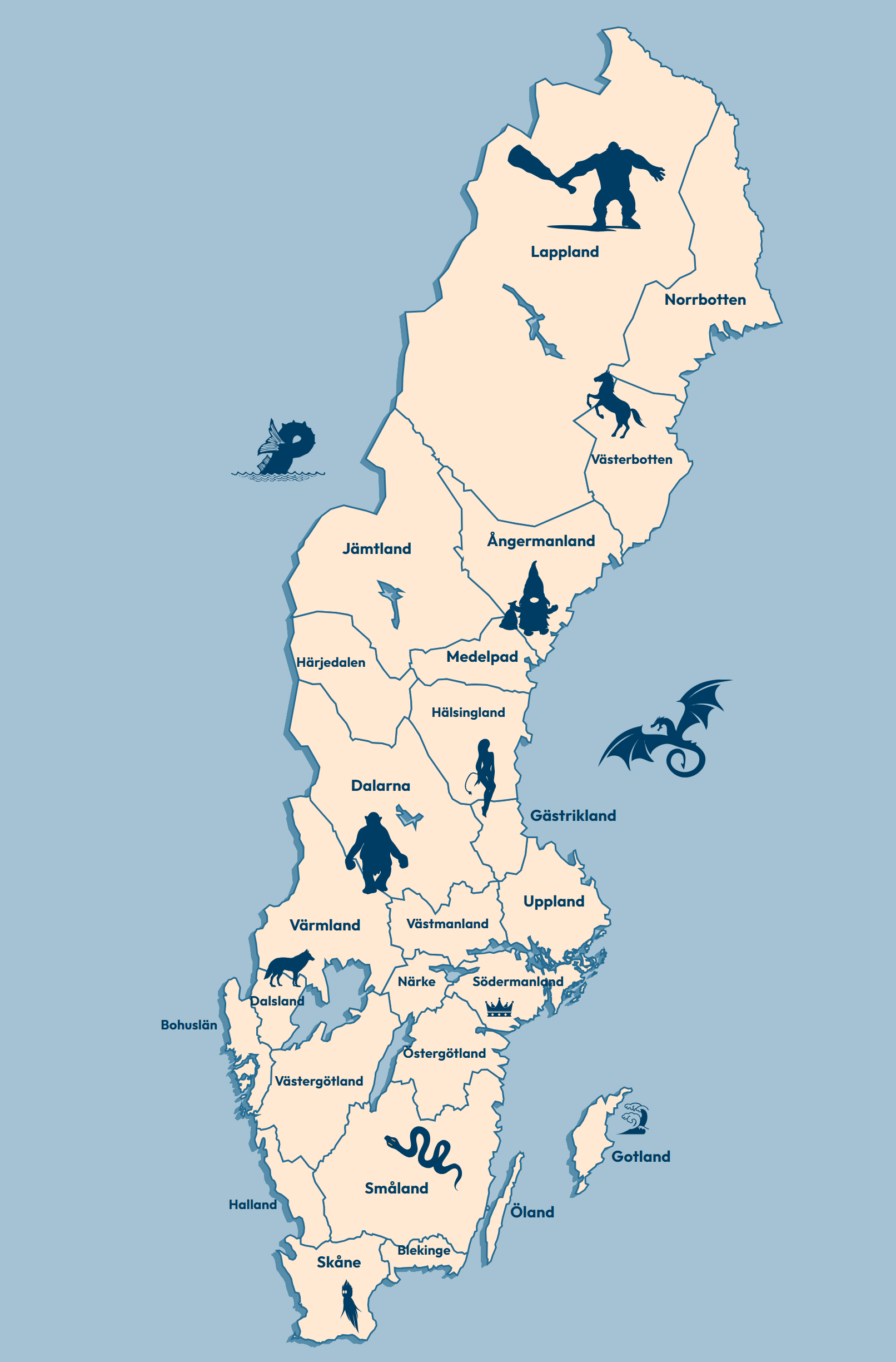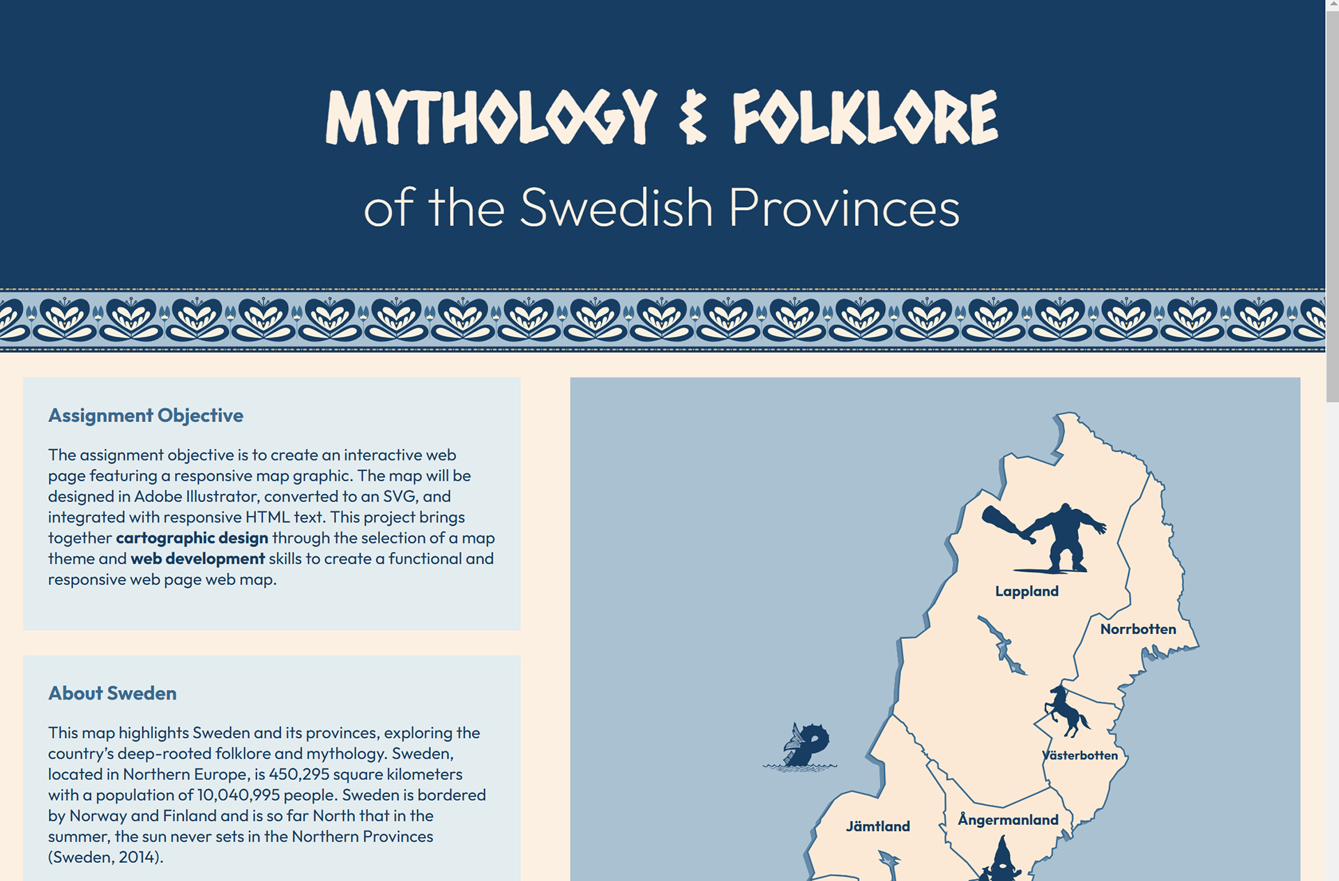 This project involved creating a modified web graphic from a static SVG file of a map of the Swedish provinces with responsive text labels. Custom icons and graphics were added and a cohesive styling applied. Using a JavaScript script for adobe illustrator, graphics could be converted into and SVG with html and CSS outputs to be embedded into a web page.